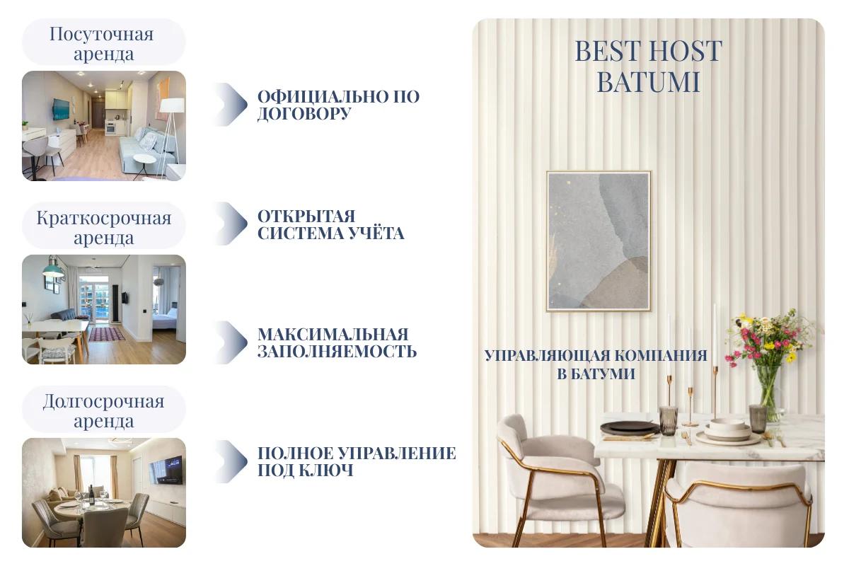 Профессиональное управление недвижимостью в Батуми с фокусом на доходность, контроль и прозрачность. Берём на себя все операционные и финансовые процессы.